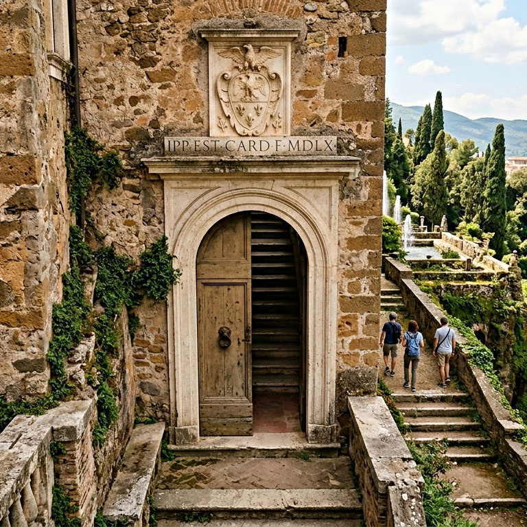 Entra a Villa d’Este dalla porta riservata a Ippolito II e alla sua corte. Lasciati alle spalle il mondo moderno e percorri l’antico accesso privato del Cardinale, dove la storia del convento medievale si fonde con l’ambizione di un principe della Chiesa. Un inizio esclusivo per un viaggio senza tempo.