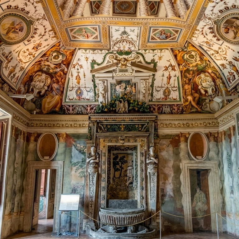 Prima dello sfarzo, il silenzio del chiostro. Esplora le radici della Villa, costruita sulle antiche mura di un monastero e su vestigia di epoca romana. Ammira come l’architetto Pirro Ligorio sia riuscito a trasformare un austero luogo di preghiera in uno dei palazzi più scenografici d’Europa.